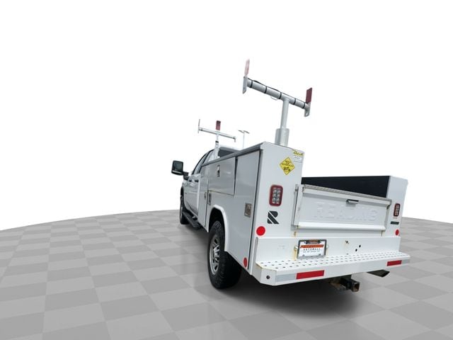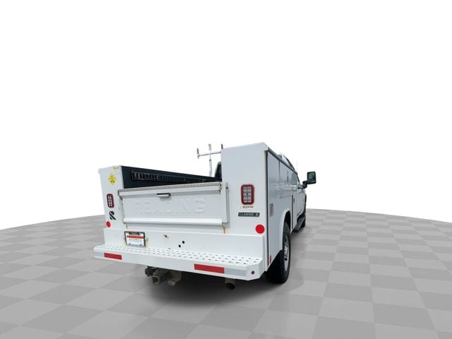 This truck was ordered with pickup box delete and fitted with a service body utility bed, providing multiple lockable storage compartments that make it ideal for contractors, electricians, plumbers, HVAC technicians, and other service professionals who need organized tool and equipment storage on the job.